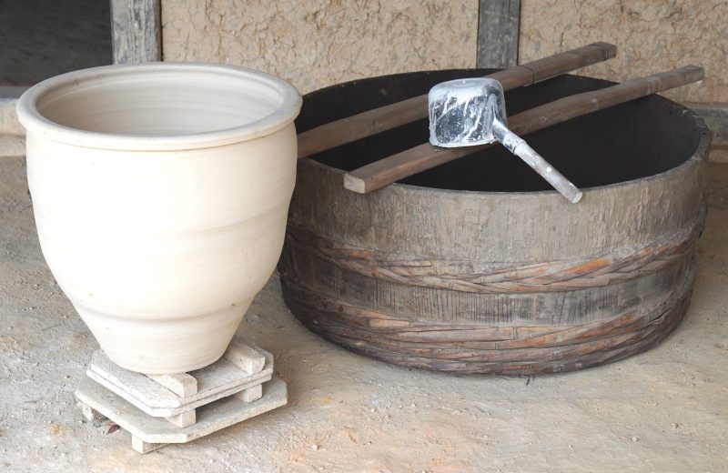 右の大きな桶は、以前釉をかけるのに使われていたものです。はじめに「はんど」を地板に乗せ、柄杓で内側にかけていきます。