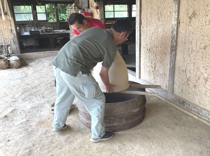続いて外側に釉をかけますが、その時は二人がかりで「はんど」をひっくり返し、桶の上でかけていきます。当時の様子を再現するため、吉田さんの指導を受けて挑戦してみました。