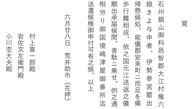 つぎに、本文について解読してみました。概要をまとめると、① 銀山附幕領大家村(本文では大江村)の権六の娘きよが「お伊勢参り」に出かけた、② その帰り道に安来で足を痛めて歩行が困難となった、③ 青駄(簡易な籠)へ乗せて「国境嶋津屋御番所」(松江藩と銀山附幕料の境に設けられた番所)まで送り返すこととなった、という内容であることが分かりました。