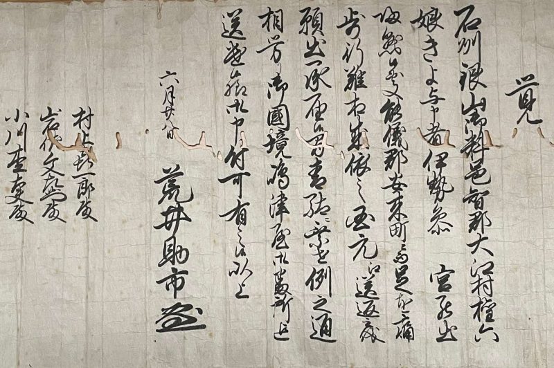 まずは、日付、差出人と宛先についてみてみましょう。この古文書は6月28日に「荒井助市」という人物が出した文書であることが分かります。この荒井助市という人物について少し調べると、天明元年(1781)から寛政3年(1791)まで松江藩の郡奉行を務めた人物であることが判明しました。宛先の村上喜一郎、岩佐文左衛門、小川杢大夫は代官を務めた人物だと考えられます(3名とも荒井の後の時代に郡奉行を務めていました)。