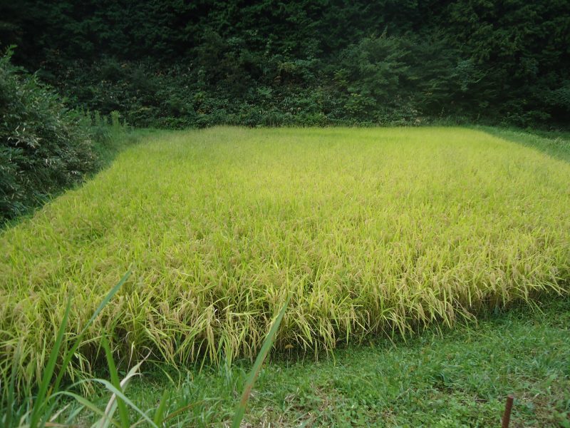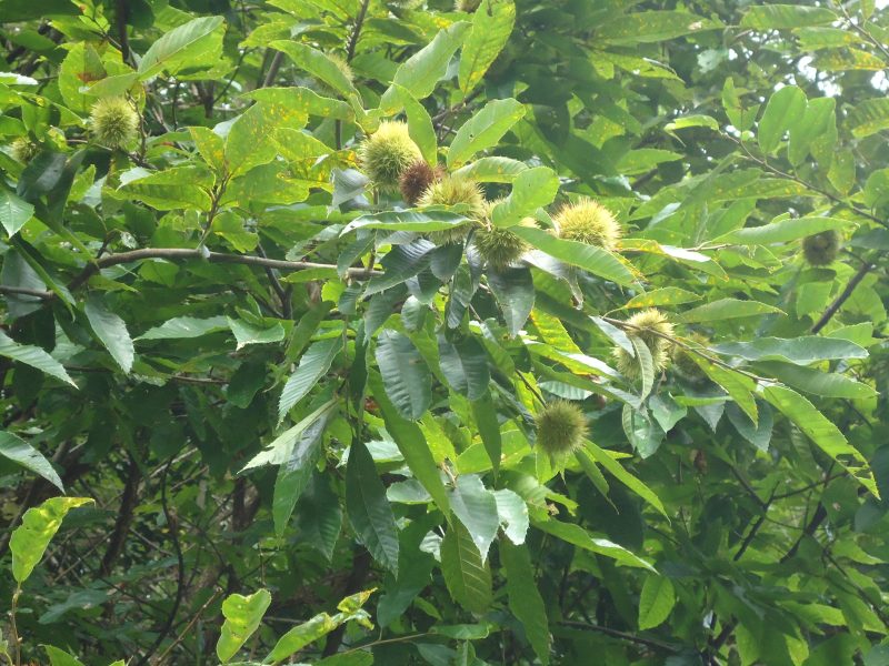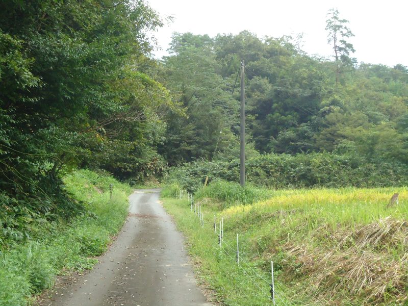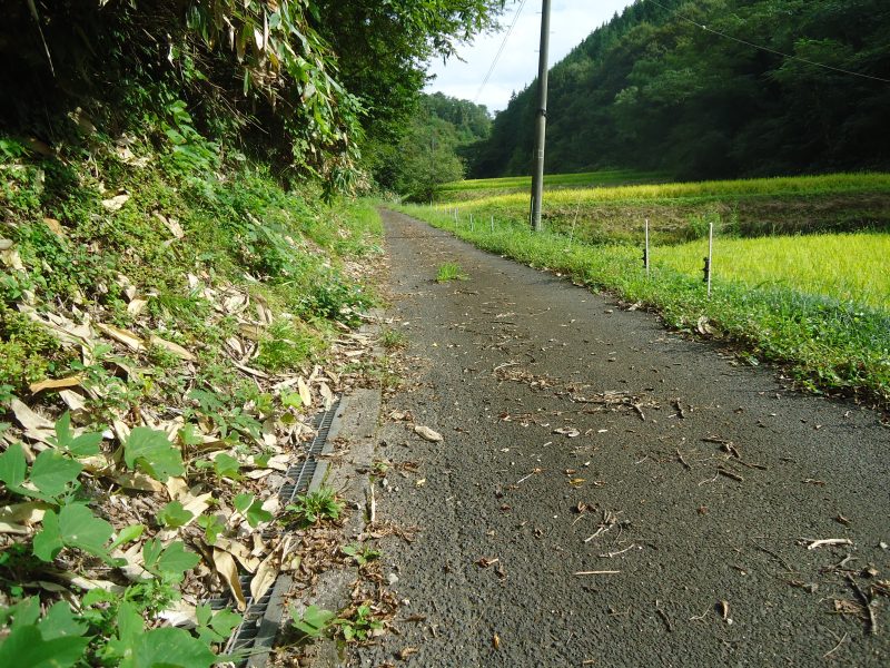 道幅は普通車幅、左には笹(葉が大きく、笹巻に向いた大きさ)、道端の溝には金属の蓋、右手には稲穂がたわわに実る水田が広がる。頭上には栗の実が(写真5,6,7)。