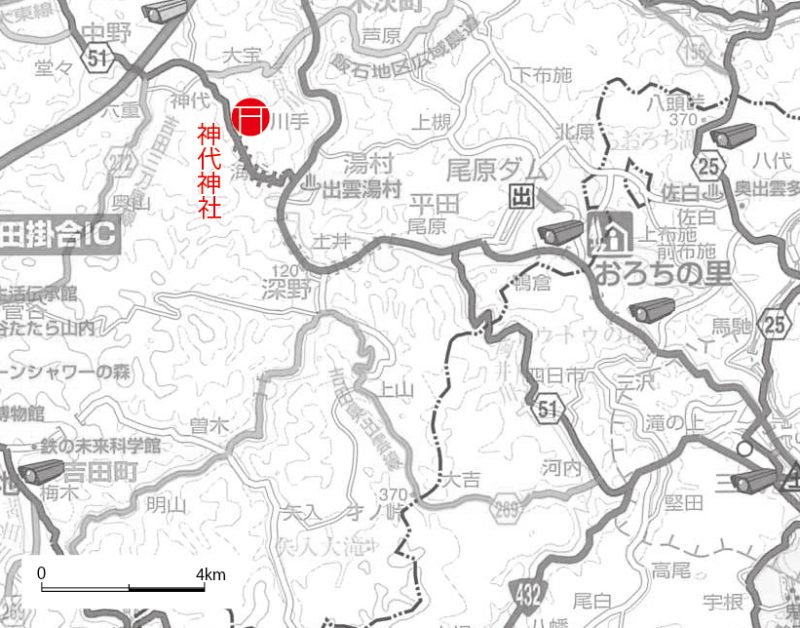 そのうちの一つに、『風土記』飯石郡「神代社」名を継承する、雲南市三刀屋町神代(こうじろ)の神代(こうじろ)神社があります。