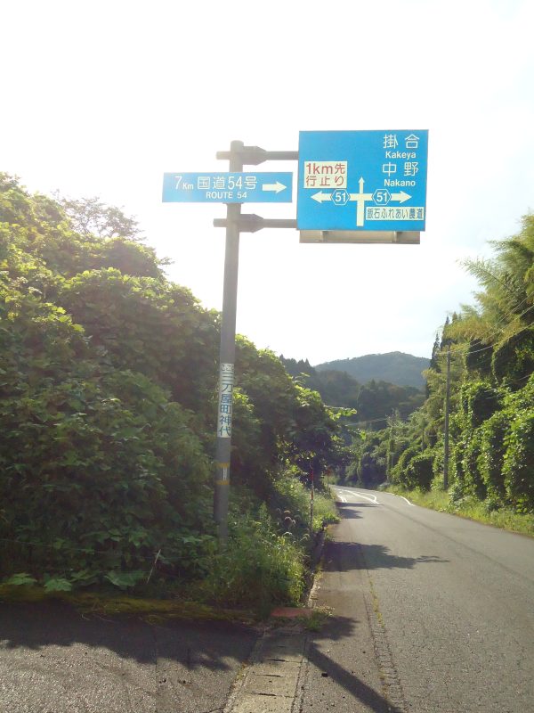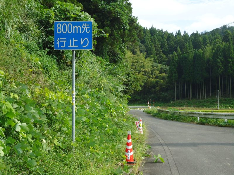 そのそばには「この先行止り」の看板。この道が県道51号線です。ここを進んでいくと、また「800m先行止り」の案内板(写真3)。