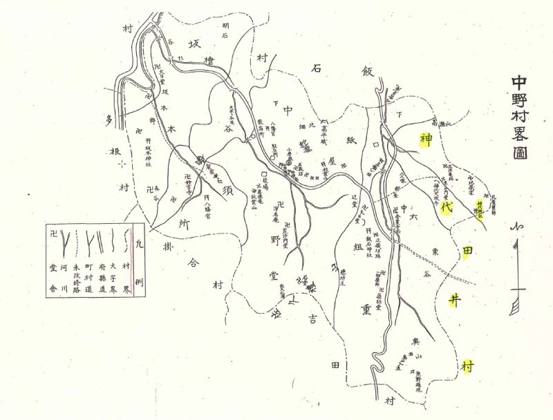 また、この神社の南西は、2004年の市町村合併前は旧飯石郡三刀屋町神代と旧同郡吉田村田井の町村堺、さらにそれ以前は、中野村と田井村の堺であった(写真17 『中野村誌』付図 (1934年)より)