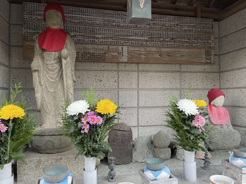 あるお堂の中の写真です。お地蔵さまが赤い前垂れをつけて安置されており、よく見かける風景ではないでしょうか。お地蔵さまの多くは、おおむね江戸時代終わり以降のものですが、中には古く中世でも後半、戦国時代頃の小型板碑が含まれています。 板碑は石で作った供養塔です。供養塔には、亡くなった人を弔う場合と、自分の死後の冥福を祈るために建てるものがあります。典型的な板碑は頂部を三角形に尖らせ、その下に2本程度の切込み線を入れますが、線がないものも多くあります。中心に仏さまや五輪塔、梵字などを刻みます。