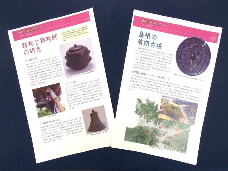 このうち、1に関わるテーマ研究として3年目を迎えたのが、「島根の前期古墳」と「鋳物と鋳物師の研究」です。このたび、それぞれの内容・成果を紹介するパンフレットを作りました。A4判2ページのPDFファイルに簡単にまとめています。ぜひ、次のリンクからダウンロードしてご覧ください。