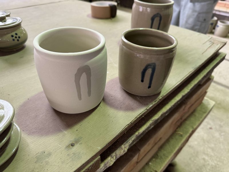 ガス窯で焼く前(左)と焼いた後(右)のつぼを並べました。窯で焼くと約15%小さくなるようです。釉も白色が灰色、模様は灰色から青色に発色しています。