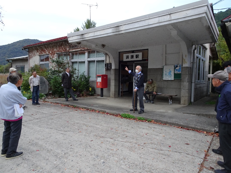 講演の後は、事前申し込みいただいた一部の参加者(20名)で、まち歩きをしました。現在「旧濱原村の歴史を語り継ぐ会」で地域の歴史を掘り起こす活動に取り組まれている山本普史氏(浜原連合自治会長)より、作成したガイドマップを配布して浜原地域をご案内いただきました。