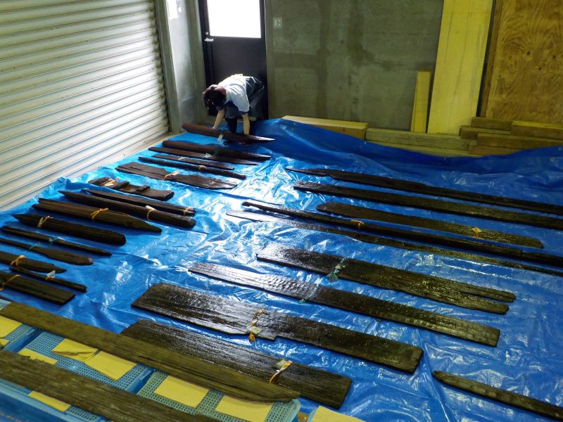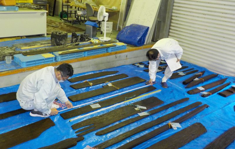 通常、木製品は遺跡から良好な状態で出土することはそう多くありません。しかし、低地にある遺跡では、地下水等で酸素が遮断され、奇跡的に大昔の木製品が出土することがあります。これらは乾燥させると収縮し変形してしまうので、発掘現場から持ち帰った後、保存処理を行うまで水槽に入れて保管します。
