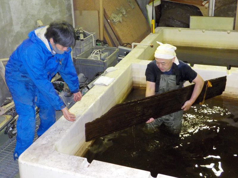 今回の調査では、大田市仁摩町の大寺遺跡で出土した木製品を腰まで水槽につかりながら取り出しました。
