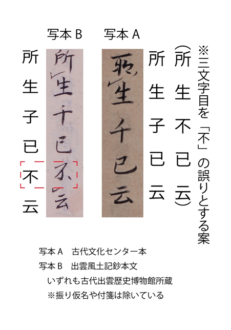 この部分の写本を見ると、写本Aでは「所生千已云」(「千」は「子」の誤写。生まれる子、すでに云《い》う=言葉を話す)、写本Bでは「所生子已不云」(生まれる子、すでに云わず=言葉を話さない)です。