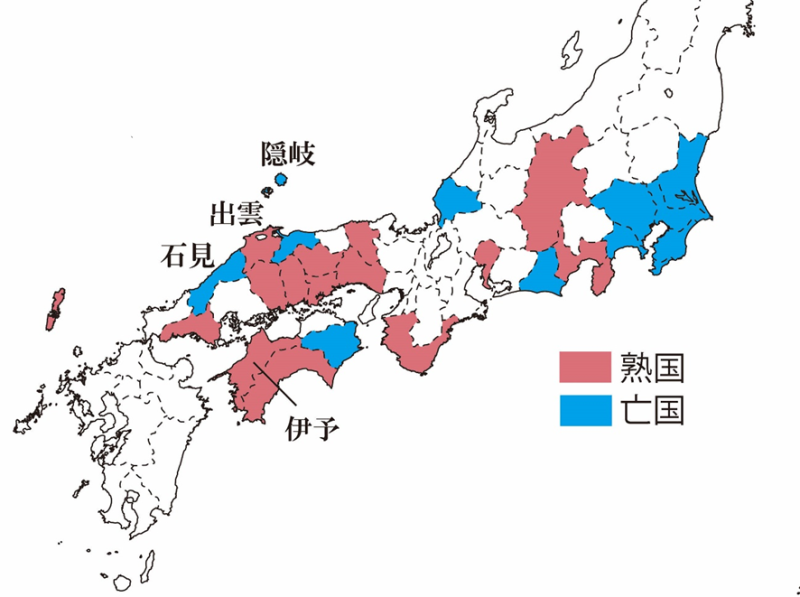 こうした諸国の「国力」を知る上で参考になるのが、平安時代後期の史料に頻繁に登場する「熟国《じゅくこく》」(「要国」とも)や「亡国《ぼうこく》」という表現です。熟国は安定した税収が確保できる国、亡国は税収が少なく国司にとって統治が難しい国を指しました。これらに明確な基準はなく、時期によっても変化するため、あくまで目安として理解すべきものですが、瀬戸内周辺に熟国が、東国に亡国が多いという傾向があります。