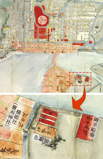 この時期、松江市内で最もにぎわう繁華街が伊勢宮《いせみや》町ですが(写真1)、そのような地名が付いたのはなぜでしょうか?それは、かつてこの場所に「伊勢宮」と呼ばれる神社が鎮座していたことに由来しています。伊勢宮は寛永21(1644)年に松江藩主・松平直政が造らせ、明治7(1874)年の大火までの間、賣布《めふ》神社の東側にありました(写真2)。
