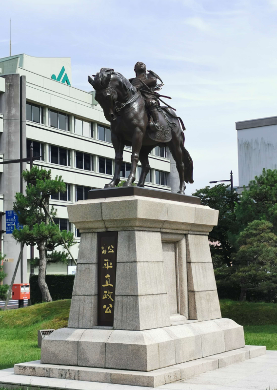 島根県庁から松江城付近にかけて、松平直政《まつだいらなおまさ》、若槻礼次郎《わかつきれいじろう》、岸清一《きしせいいち》など多くの銅像が立っています。その中でも松平直政公銅像は、台座の上で天を仰ぐ姿がひときわ目立っています。今回は、その直政公銅像が辿《たど》った歴史を、少しばかりのぞいてみたいと思います。