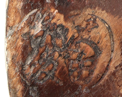 面の裏には、朱漆で「享保四己亥年十□月吉辰」「宮田筑後」などと記されており、「宮田筑後」と読める焼印も押されています(□は判読不能文字)。宮田筑後は、生没年は不詳ですが、17世紀後半から18世紀前半に京都で活動していた面打ちでした。