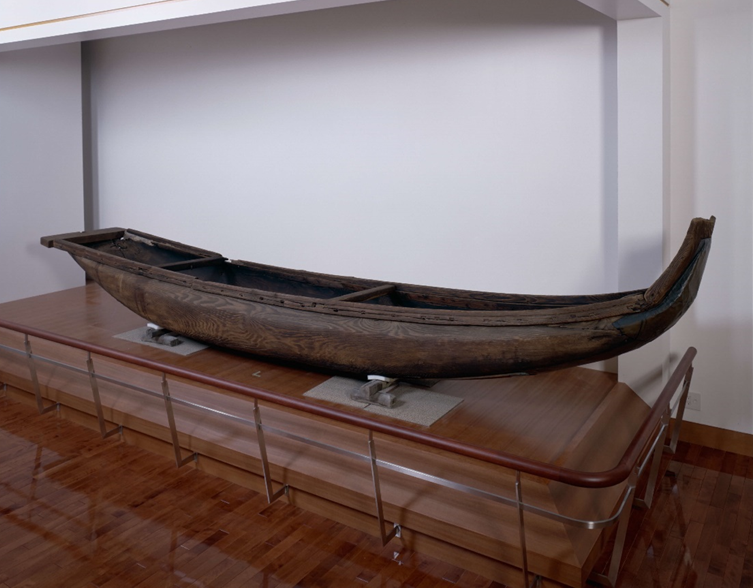 このそりこ舟は実は木を削って造った「くり船」で、遺跡から見つかる古代の丸木舟に類似するものです。もともとは1本の木を削っていたようですが、大木の入手が難しくなり、2本以上の木をそれぞれ削って、つなぎ合わせる方式に変わったものが今に残されています。現在、同じ構造の船で、現役で使用されているものに、松江市の美保神社で行われる諸手船《もろたぶね》神事の諸手船があります。