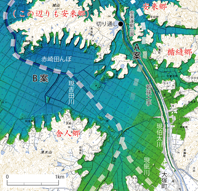 これとは別に、『安来市誌』はA案より古い流路として、「伯大川」が吉田川の河道を通っていたのではないかと推定しています(B案)。「伯大川」が現在の疵川《きずかわ》付近を通り吉田川と合流していたとすると、この流れは地形の低い部分を通るので自然に理解できます。