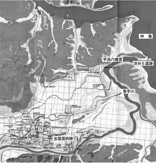地図は当時を復元した地形図です。遺跡から南西2㌔に奈良時代の出雲国の役所である出雲国庁があります。国庁は鎌倉時代まで遺跡が存続し、その後は平野全体に役所、町などが分散するようになり、出雲中世府中と呼んでいます。