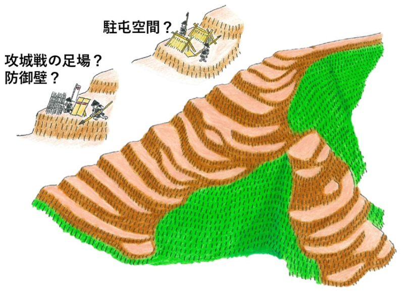例えば、敵方の城に向かって接近するように階段状の平坦地が連なっていく場合、「仕寄《しよせ》」(城攻め)のための足場となったり、反対に敵勢の反撃を防ぐ防御壁(切岸《きりぎし》)となった可能性も考えられます。