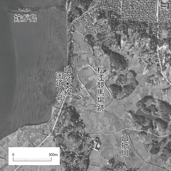 意宇《おう》郡の蚊島《かしま》(嫁ケ島)として記述がある、といいたいところですが、結論を急がず、まずは松江市浜乃木1丁目にある学校のトラックのような人工的な地割から説明したいと思います(航空写真)。ご存じの方も多いかもしれませんがこれは1929(昭和4)年完成、1937(同12)年に廃止された松江競馬場の跡地で、走路が完全に残っている事例として全国唯一の珍しいものです。