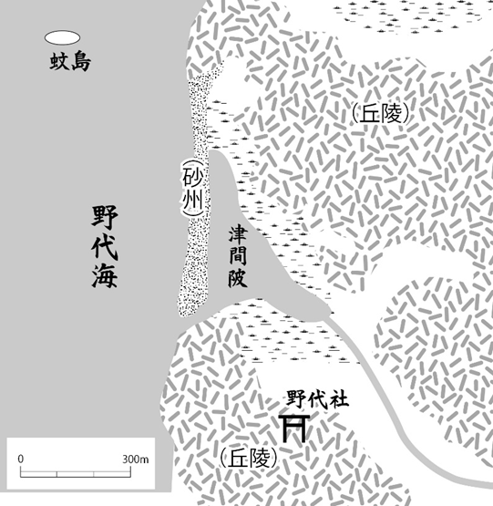 風土記には、島根郡にここと同じように白砂青松の砂州で海から隔てられている潟湖、前原陂《さきはらのつつみ》の様子が詳細に記されており、景観が優れているだけではなく、男女が集って遊興する場所だとされています。風土記では今の宍道湖・中海は入海として一括されていますが、蚊島周辺だけは、唯一「野代海」と個別の名前が記されています。この場所は古代人にとっても、現代同様、というか現代以上に特別に優れた景観の場所で、人の集まるいわゆる名所だったのではないかと想像されます。