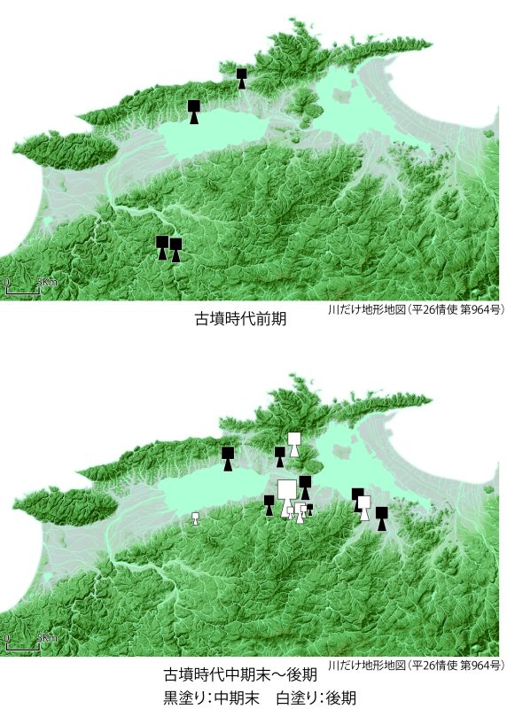 この状況は全国的にも特殊で、出雲の中期末~後期に築造される前方後方墳は、王権に対する独自性を象徴するものとして扱われてきました。また分布域も前期と中期末~後期では大きく異なります。前期では当時の出雲地域で中核をなす荒島地域の周縁部に分布しますが、中期末~後期では、この時期に出雲東部の中心となる意宇平野(松江市南部)に集中します。時期的な隔たりや分布の状況からは、両者には連続性は認められず、別の系譜によって出現したものと考えられます。古墳時代前期の前方後方墳は出現の背景に北陸との関係が指摘される一方で、中期末に再出現する状況は、独自の地域内秩序を構築するため、首長層の連携を表象する存在として創出されたと指摘されています。このように時代によって、同じ墳形でもその選択制には外的な要因と内的な要因が働いていることがわかり、当時の地域社会の一端を垣間見ることができます。