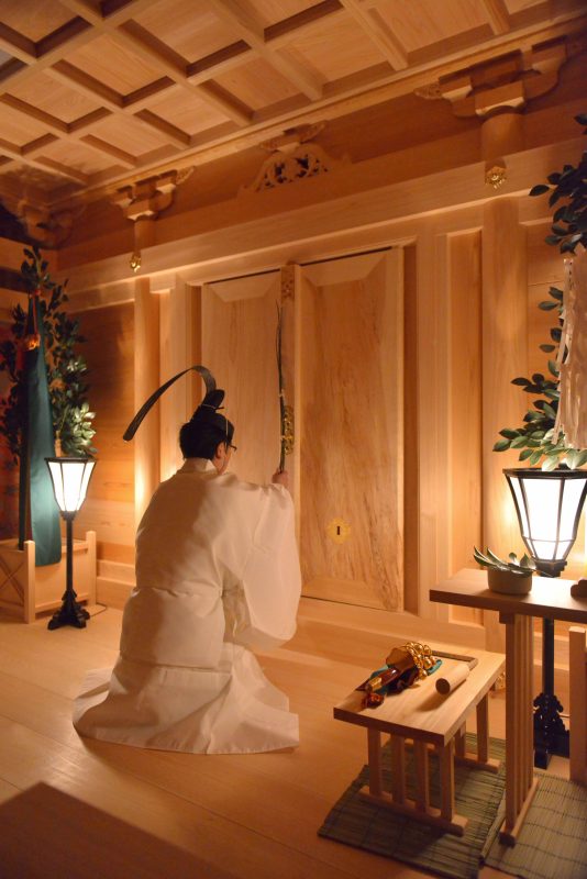 旧暦10月、全国から出雲に集った神々にお帰りを願う神事でも、梅の楉を用いるところがあります。万九千《まんくせん》神社(出雲市斐川町)では、26日夕刻の「神等去出祭《からさでさい》」で、宮司が社殿の扉を梅の楉でたたきながら「お立ち」と3度唱えて、神送りします。多賀神社(松江市)でもかつては社殿を梅の楉でたたいたと伝わります。