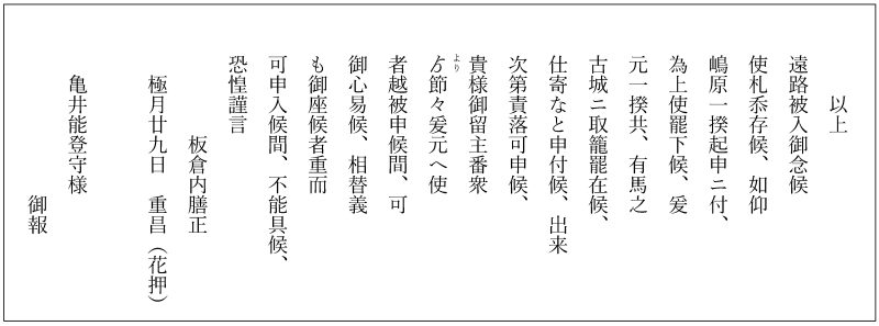 この書状は、1637年12月29日に、一揆鎮圧の幕府軍の総大将であった板倉重昌《いたくらしげまさ》が津和野藩主の亀井茲政《かめいこれまさ》に宛てた書状です。まずは書かれている文字を読み解いてみましょう。