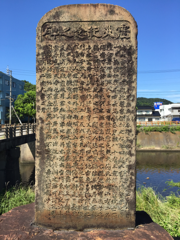 地震から24年後に地元の住民によって建てられ、1943(昭和18)年の大水害で流出し再建されました。現在は、地元自治会により解読文を記した説明板が建てられています。碑文は漢文350字で、次の⑴~⑺のように書かれています。