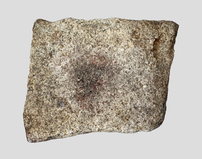 このような特徴をもつ石は松江市から吉賀町まで、県内各地の弥生時代の遺跡から出土しています。どの石も形は同様で、中央が円形に赤か黒色に変色しています。細かく見ていくと茶色く変色した部分も多数見られます。いずれも金床石の可能性があり、鉄器加工が盛んにおこなわれていた可能性がありそうです。