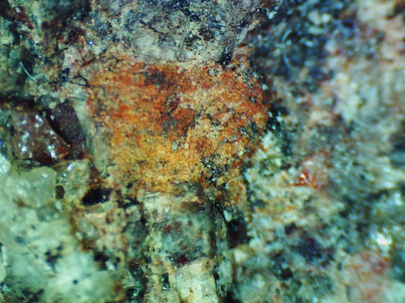 この石は雲南市木次町に所在する北原本郷遺跡の竪穴建物から出土した幅12~16㎝ほどの平たい石です。弥生時代後期ごろのものと考えられます。さて、この石をじっくり観察してみると中央が円形に赤く変色しているのが分かります。さらにその中央には黒色物が付着しています。赤い変色は熱を一定時間受けたことを示しており、黒色物はなんらかの炭化物などが付着していると考えられます。中央部分を触ってみると何かを叩いたような痕跡もあります。肉眼の観察などで得られる情報は限られていますが、石の表面をデジタルマイクロスコープで30倍に拡大すると、細かくこびりついた黒色物、その周辺に茶色く変色している部分が確認できました。