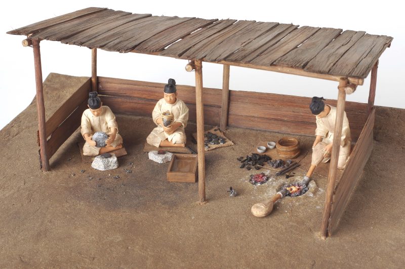 鍛冶工房は奈良時代の復元、左の2人が作業で金床石を使用している