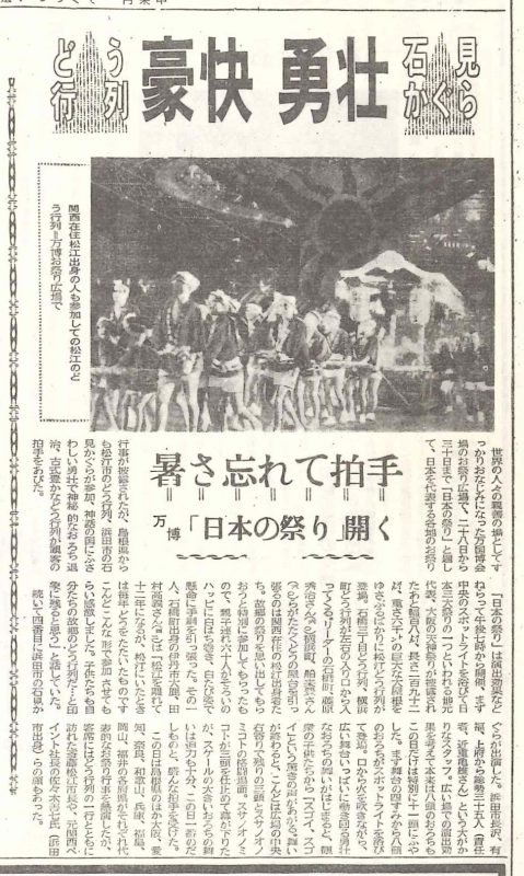 同月30日付『島根新聞』には「どう行列 石見かぐら 豪快 勇壮 暑さ忘れて拍手」の見出しで、「日本のまつり」出演時の様子が伝えられ、太陽の塔を背に鼕宮を曳≪ひ≫く一行の写真が掲載されています。