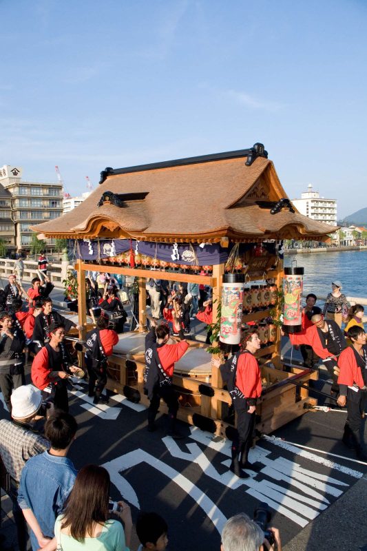 「鼕」は大太鼓を意味する出雲地方の言葉です。毎年10月第三日曜に開催される鼕行列は、松江市内の町内や団体ごとに鼕を据えた屋根付きの屋台(鼕台・鼕宮)が出され、大人数で鼕を打ち鳴らしながら練り歩くものです。「日本のまつり」に参加したのは横浜町と石橋町三丁目在住者約100名でした。
