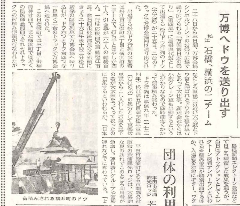 昭和45年(1970)7月26日付『島根新聞』には「万博へドウを送り出す」という見出しで、鼕の積み込み作業の様子が報じられています。