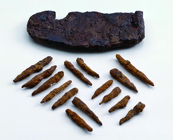 現時点までの成果として、主に2つのことが挙げられます。1点目として出雲地域の伝統的な玉作技術が平所遺跡でも確認できることです。松江市域では弥生時代前期末以降、「施溝分割《せこうぶんかつ》技法」により管玉を生産しています。これは、軟らかい石材である緑色凝灰岩を石鋸《いしのこ》で施溝分割しながら管玉を製作するもので、平所遺跡でもこの技法による管玉生産の過程で作出される板状の石材が確認できました。このことから、在地の玉作工人が平所遺跡での玉作に関与したことを想定できます。2点目として鉄製工具を利用した新たな玉作技術が東方から流入したことが確認できたことです(写真3)。鉄製工具は弥生時代中期後半に京都府京丹後市に所在する奈具岡《なぐおか》遺跡で玉作に用いられた以降、日本海沿岸地域を中心として玉作に利用されています。硬い石材である水晶や碧玉の加工のために鉄器が利用されたとの考えが一般的であり、山陰へは後期前半に鳥取県域、後期後半に島根県域へ製作技術が流入しています。また、平所遺跡の鉄製工具には玉の穿孔に用いた鉄針など多様な種類の工具が確認できており、先行する玉作工房で使用された鉄製工具の系譜を引き継ぎながらより発展した様相となっています。これらのことから、鉄製工具を使用した玉作技術を有する工人集団が日本海沿岸地域を東から西へ移動し、平所遺跡で碧玉や水晶を用いた玉作を行った可能性もあります。なお、先に示したように在地の玉作技術も認められることから、在地の工人集団と統合したことも考えられます。平所遺跡周辺では玉作工房が営まれた時期と同時期に小規模ながら四隅突出型墳丘墓を多数築造していることが分かっています。このことからこれらの墳丘墓に埋葬された地域有力者層の管理下において玉作が行われていたことも想定できます。