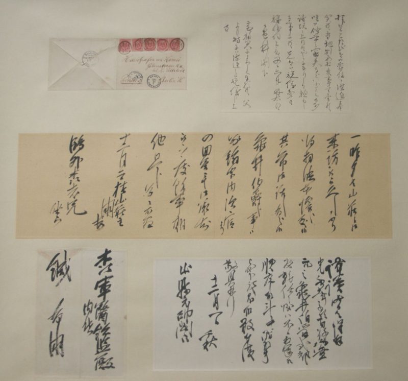 さて、掛け軸にはまだ2通の書簡があります。これらは①山縣有朋《やまがたありとも》が鴎外に宛てた、亀井伯爵の事は宮内次官《くないじかん》の書簡のとおりであると伝えた書簡、②宮内次官の渡辺千秋《わたなべちあき》が山縣有朋に宛てた、亀井伯爵が式部官《しきぶかん》に就任する事を伝えた書簡です。3人の役職や書簡の内容からすると明治42年の書簡で、亀井伯爵はこの時の当主であった亀井茲常《これつね》であると考えられます。亀井茲常の情報が、山縣有朋を通じて森鴎外にもたらされたという事は、鴎外が若き亀井家当主である茲常を案じていた事を物語るものでしょう。