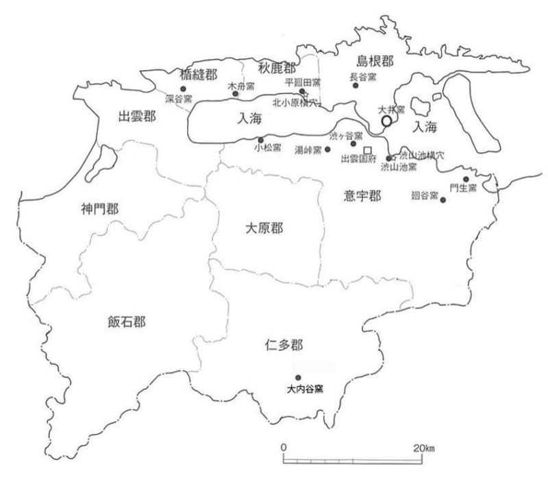 須恵器は、青灰色の硬い焼き物で古墳時代に朝鮮半島から技術が伝わり、5世紀後半になり出雲の地でも登り窯が築かれ焼かれるようになります。古墳時代後期の横穴墓では、多くの須恵器がみられ埋葬する際に墓の前面にお供えとして壺、坏などが置かれていました。松江市朝酌町の大井古窯跡群は、非常に大規模な窯跡群で9つの支群に分けられています。奈良時代にも国府で使用される須恵器のほとんどがここで焼かれています。『出雲国風土記』の研究で大井古窯跡群のある朝酌郷の記述から朝酌とは出雲国造出雲臣の奉祭する熊野大神に贄を奉った集団が居住した地とされ朝酌郷は出雲臣とも結びつきがあると考えられます。また、須恵器に「社邊」とヘラ書きされた土器がみられ生産者の可能性があります。古代の氏族名の社部《こそべ》臣は、朝酌郷・大井浜のある島根郡の郡司であることから、須恵器生産に関わりがあったと思われます。また、一般的な坏、壺、以外で陶棺と呼ばれる埋葬用に焼かれた棺が朝酌地域の古墳で焼台とともに使われており、須恵器の生産集団の墓の可能性があります。平安時代になると出雲では須恵器の使用が減少していきます。奈良時代に須恵器の生産地は大井古窯跡で一元的に行っていましたが、8世紀後半になると宍道湖、中海の沿岸部を中心に小規模な窯が分散してみられるようになります。出雲市小境町木舟《きふね》窯、松江市宍道町小松窯、安来市廻谷《さこたに》窯、門生黒谷《かどうくろたに》窯、奥出雲町大内谷《おおうちたに》窯です。門生黒谷窯以外は、前時代に周辺に窯が存在しない場所です。9世紀後半には松江市古曽志平廻田窯、松江市東出雲町渋山池《しぶやまいけ》窯で、いずれも操業時期は短期間で木舟窯以外は1基単独の小型の窯です。その後、出雲における須恵器生産は、10世紀の前半に終焉を迎えることになります。(図1)