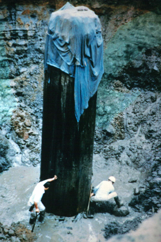 三瓶山麓の巨大な〝埋もれ杉〟の存在は、地元では早くから知られていました。春の田起こしの際に、その上部が農機具に引っかかり、邪魔者扱いされていたからです。1983年の圃場《ほじょう》整備の際には、〝埋もれ杉〟が重機で掘り出されましたが、10㍍掘り下げても抜くことができず、途中で切られています。