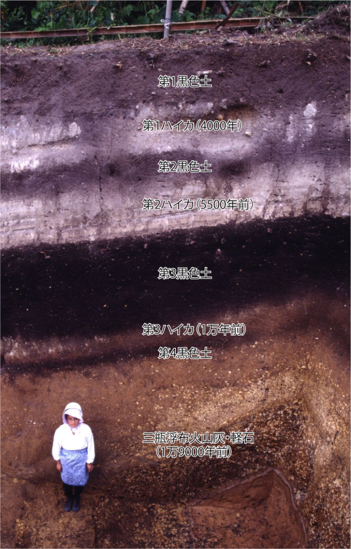 板屋Ⅲ遺跡では、縄文土器を含む層と火山灰の関係を明らかにするため、調査区の一部を深く掘り下げました。そうしたところ、三瓶山の火山灰と、その活動休止期に植物が繁茂してできた黒色土が幾重にも重なっていました。この黒色土の中には、縄文土器や石器が含まれています。