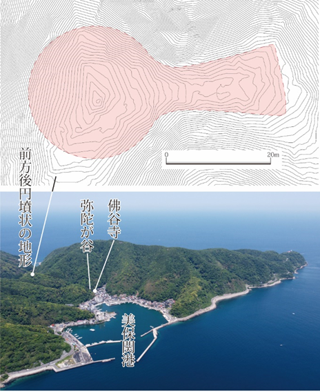 古墳時代の美保関にこのような首長がいたことは、これまであまり注目されていませんでしたが、佛谷寺背後の丘陵を丁寧に調べると、全長45㍍程度の前方後円墳に見える地形があることも新たに分かりました[写真2]。有力者の存在を裏付ける手がかりとして注目されます。