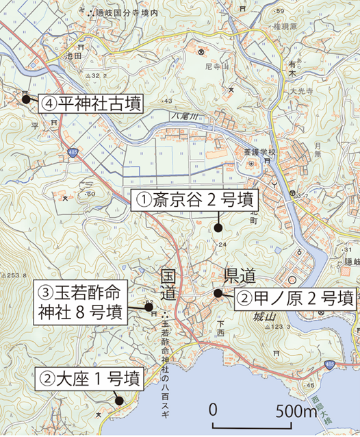 一方、古墳時代後期、6世紀後半になると、甲ノ原から北1.5㌔のところに④平《へい》神社古墳が築かれます。隠岐地方最大の前方後円墳として知られる古墳で、八尾川流域を一望できる位置にあり「平野全体の支配者」として、ふさわしい立地といえそうです。流域の開発が奥まで進むにつれて、豪族の関心が小さな谷や海だけでなく、平野の奥にも向いた―そんな変遷があったと考えられます。