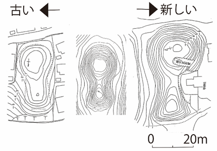出土品が見つかっていない古墳は、地表面の観察や古墳の形で時代を推定する方法があり、前方後円墳では前方部が小さいものが古く、次第に大きくなるとされています。