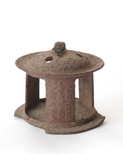 その初期の作品の一つが、巖倉寺《いわくらじ》(安来市広瀬町)の鉄製釣燈籠《てつせいつりどうろう》です。高さは約20㌢で、丸い笠と台の間に明かりをともす火袋《ひぶくろ》があり、その周囲3方向に銘文を刻んだ長方形の柱と火口《ひぐち》があります。