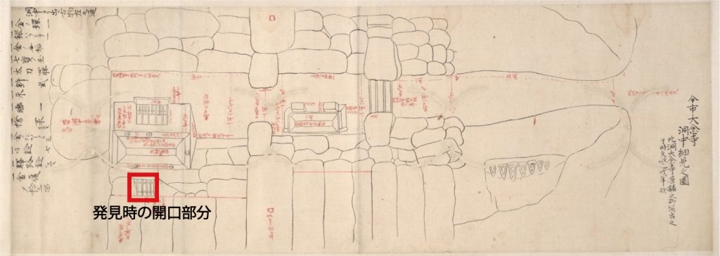 このうち、『今市大念寺洞中細見之図』には、横穴式石室の奥壁に近い壁面の上部に「窓」があり、「此《この》所ノ石ヲ取ノケ初テ穴ヲ見出ス」と書かれています。石室は、その入口である羨道《せんどう》が開口したのではなく、奥壁近くの高い位置にある石材が取り外されたことで見つかったのです。
