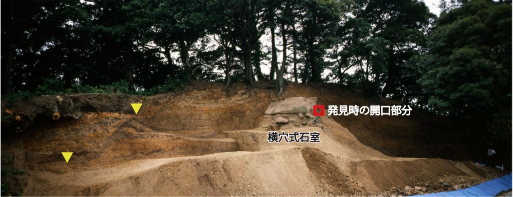 大正時代に調査した野津左馬之助《のつさまのすけ》(島根県史編纂《へんさん》委員)は、大念寺古墳が前方後円墳であることは「後円部の丘斜面及び堂宇建設の為めに削り去られたる切岸面の土層状況よりて明なり」と述べています。つまり、墳丘の中心線に沿うように盛土が削り取られた結果、石室の奥壁側が露出することとなり、その崖面では、後円部に前方部が接続する前方後円墳の特色を長らく見ることができたようなのです。